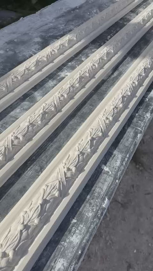Elegant cornice featuring a bayleaf and cross-ribbon motif, measuring 83 mm wide and 30 mm deep. Supplied in 1850 mm lengths and cast in superfine plaster for a crisp, detailed finish. Minimum order of 5 lengths. Priced at £55 per length — the price shown is for 5 lengths.
