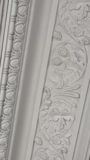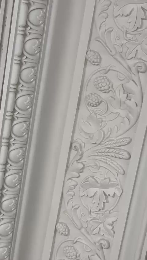 A large decorative cornice with exceptional detailing along the ceiling frieze ,dropping down to a decorated egg and dart section ,finished along the wall line with a double bed and reel. Produced in fine casting plaster, reinforced with timber laths and hessian, all hand cast.